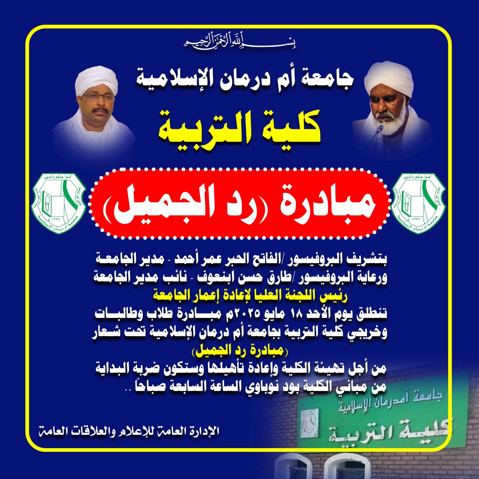 بتشريف البروفيسور الفاتح الحبر عمر أحمد مدير الجامعة وتحت رعاية البروفيسور طارق حسن ابنعوف نائب مدير الجامعة و رئيس اللجنة العليا لإعادة إعمار الجامعة. تنطلق يوم الأحد ١٨ مايو ٢٠٢٥م مبادرة طلاب وطالبات وخريجي كلية التربية بجامعة أم درمان الإسلامية تحت شعار (مبادرة رد الجميل).. من أجل تهيئة الكلية وإعادة تأهيلها وستكون ضربة البداية من مباني الكلية بود نوباوي الساعة السابعة صباحاً..