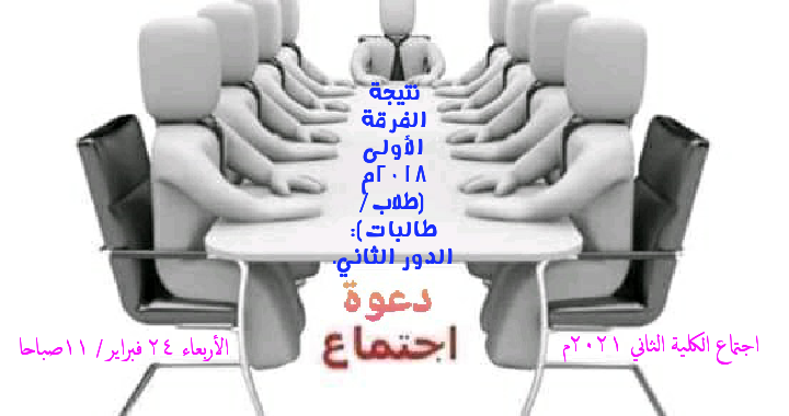 البروفيسور/ عطا محمد أحمد؛ عميد الكلية؛ يبلغكم تحياته ويدعوكم لاجتماع مجلس كلية التربية الثاني لسنة ٢٠٢١م في يوم الأربعاء ٢٤ فبراير الساعة ١١ صباحا بقاعة اجتماعات الكلية، وذلك لمناقشة عديد الموضوعات من بينها: نتيجة الفرقة الأولى ٢٠١٨م (طلاب/طالبات): الدور الثاني....